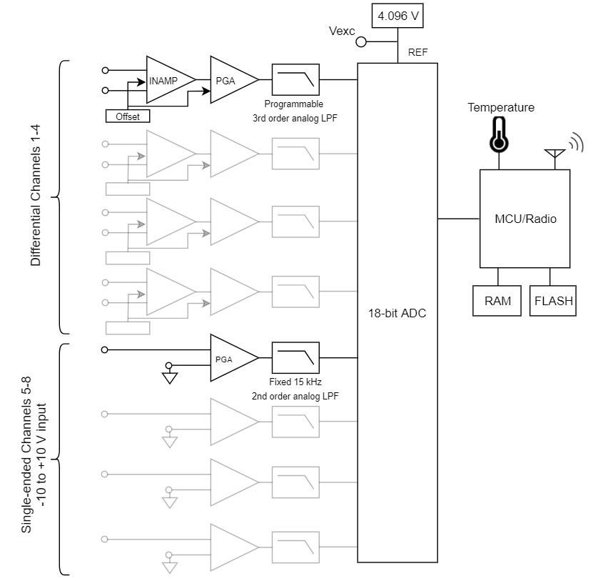 • 四个 ±156 mV 差分输入通道; • 四个 ±10.24 V 单端输入通道; • 4.096 V 传感器电源输出; • 差分输入的可调增益(16 至 2048); • 用于差分输入的可调抗混叠滤波器; • 高分辨率 18 位数据; • 与 120、350 和 1kOhm 惠斯登电桥传感电路兼容; • 差分通道上可用的工厂桥完成; • 使用板载分流电阻器进行远程应变校准; • 板载温度传感器 (±0.3°C)。 | •高达4kHz的连续采样率; •连续、定期突发或事件触发的操作; •LXRS协议允许无损的数据收集,可扩展的网络规模,以及±50微秒的节点同步; •数据记录高达800万个数据点; •室外无线范围可达1.5公里。 | •内部电池(4个AA 3.6V LiSOCL2); •外部电源(7.5 - 36V); •螺栓式或DIN导轨式安装; •-40至+80°C工作温度范围; •ESD:4kV。 |